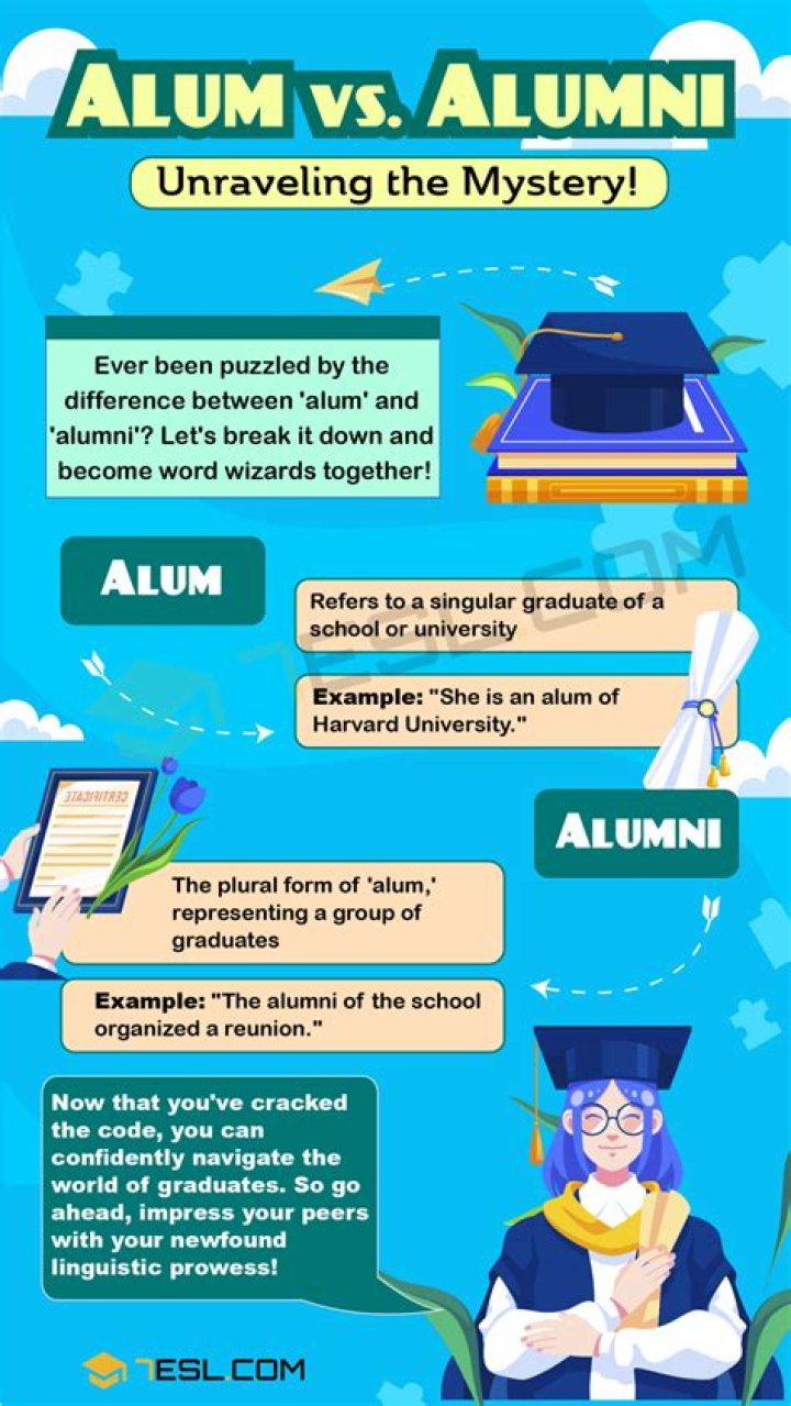 Alumni is a plural noun referring either to agroup male graduates or to a group of both male and femalegraduates. The singular alumnus refers to one malegraduate, alumna refers to one female graduate, and theplural alumnae refers to a group of femalegraduates.Is alum a proper word?