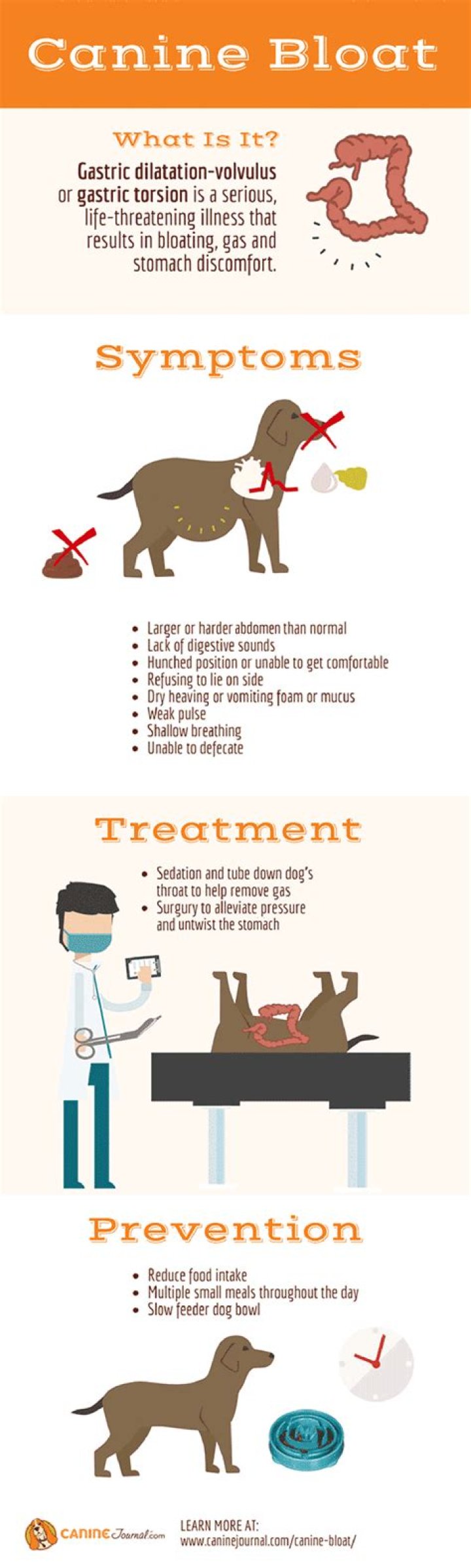 To prevent bloat and subsequent torsion, feed the dog small meals several times a day rather than one large meal, and see that heavy exercise is avoided after meals. Check the next section for advice on what to do if your pet has a broken leg, including how to attach a splint.Do dogs with bloat drink a lot of water?