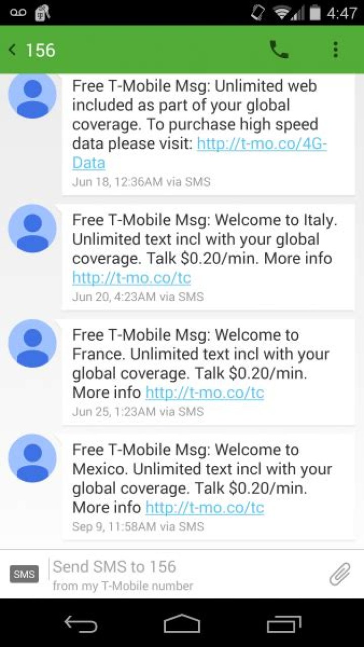 These are the fees you pay your mobile providerto send or receive SMS messages. This could be a couple ofhundred messages or more than a thousand, depending on your plan.Per-Message Charges: You are charged afee, usually a few cents, for each text messageyou send or receive.Does TMobile charge for data roaming?