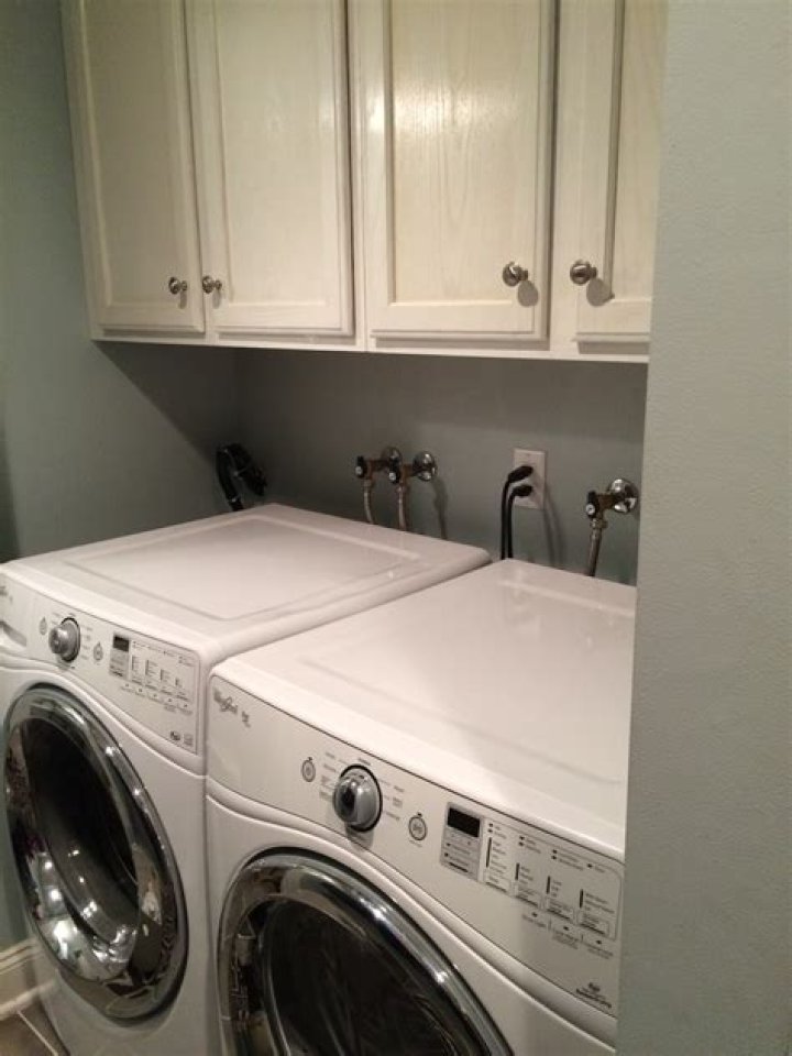 Since washer and dryer plumbing usually is located midway down a wall, use a fabric skirt to hide the plumbing and appliances. Attach the skirting to a built-in shelving unit over your appliances or a tension rod between the two walls where your washer and dryer are located.How do you measure space for a washer and dryer?
