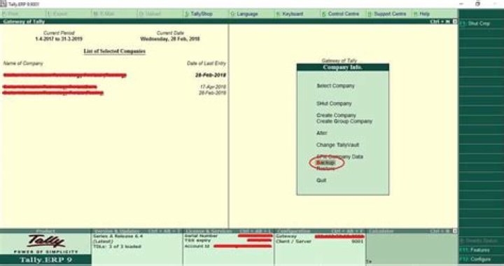 - Step 1: - Backup you're Data. Gateway of Tally → Alt + F3 (Company Info) → Backup.