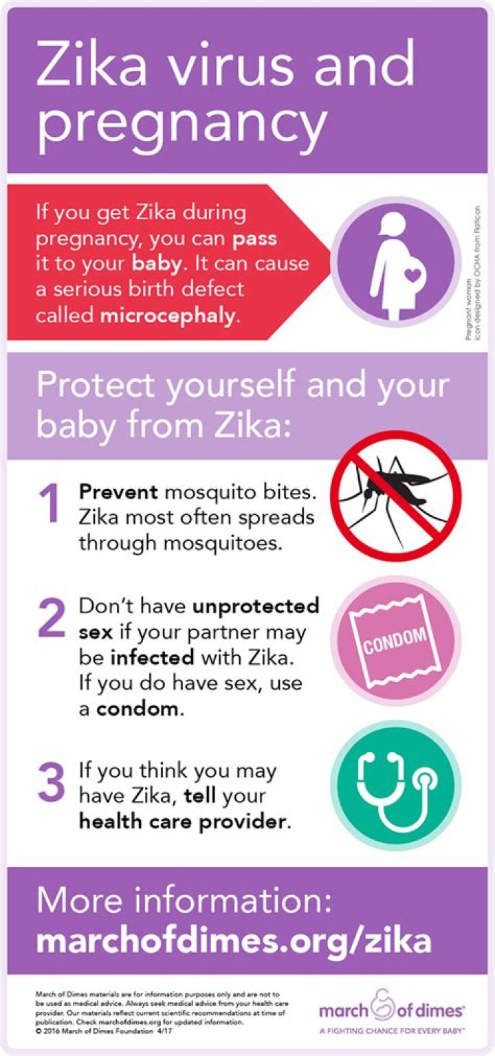 Zika virus can be passed from a pregnant woman to her fetus. Infection during pregnancy can cause a birth defect called microcephaly and other severe fetal brain defects. Zika primarily spreads through infected mosquito bites. There is no vaccine to prevent or medicine to treat Zika.