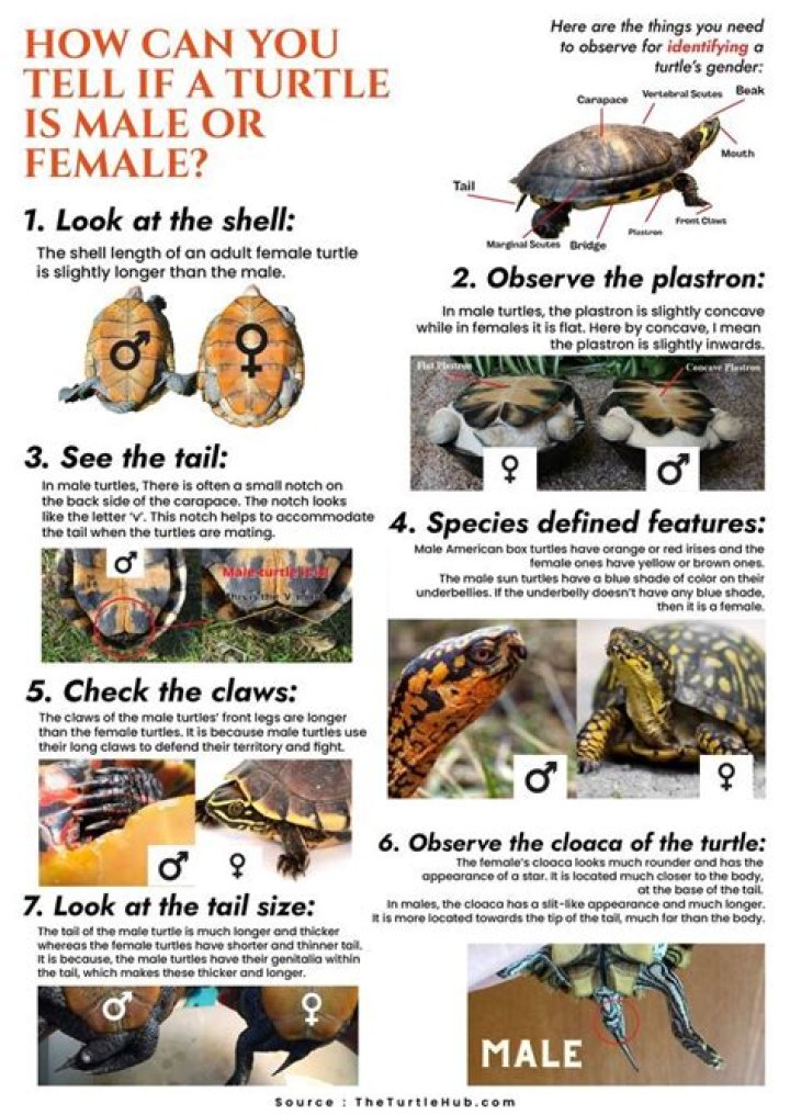 The most common way to determine gender in a turtle is to look at the length of its tail. Female turtles have short and skinny tails while males sport long, thick tails, with their vent (cloaca) positioned closer to the end of the tail when compared to a female..