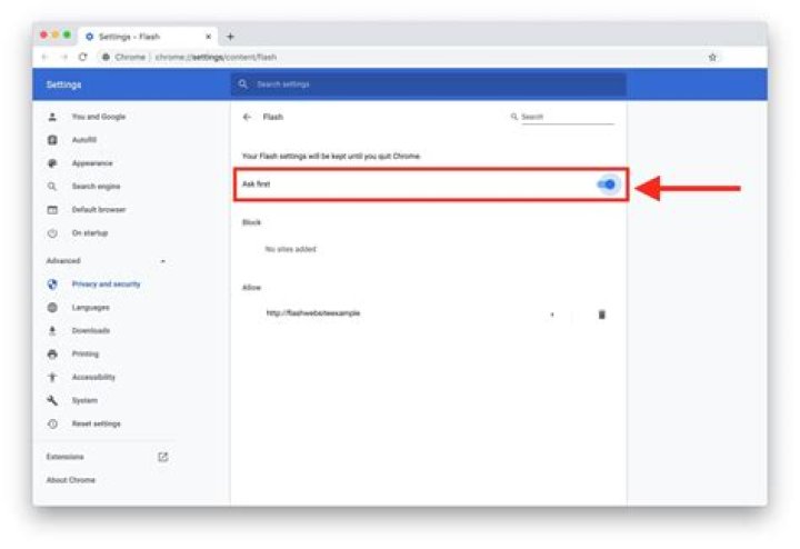 Go to Settings > Advanced > Content Settings > Flash. Then, in the option for Flash, turn on “Ask First.” You can also add specific websites to either block entirely or allow to play Flash content without needing permission first.How do I get rid of Adobe Flash Player pop up on my Mac?