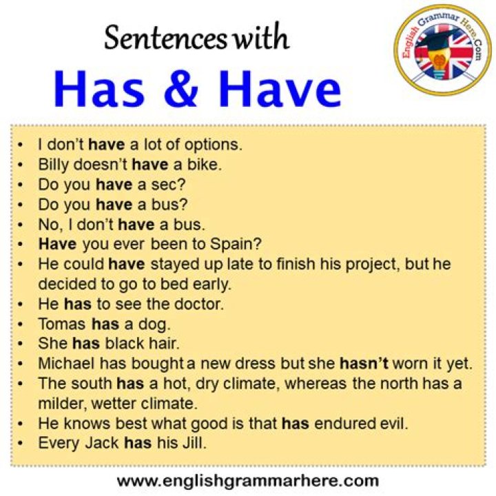 Have is the root VERB and is generally used alongside the PRONOUNS I / You / We / Ye and They and PLURAL NOUNS. Generally, have is a PRESENT TENSE word. Has is used alongside the PRONOUNS He / She / It and Who and SINGULAR NOUNS. However, there are some exceptions which will be explained later on in the lesson.