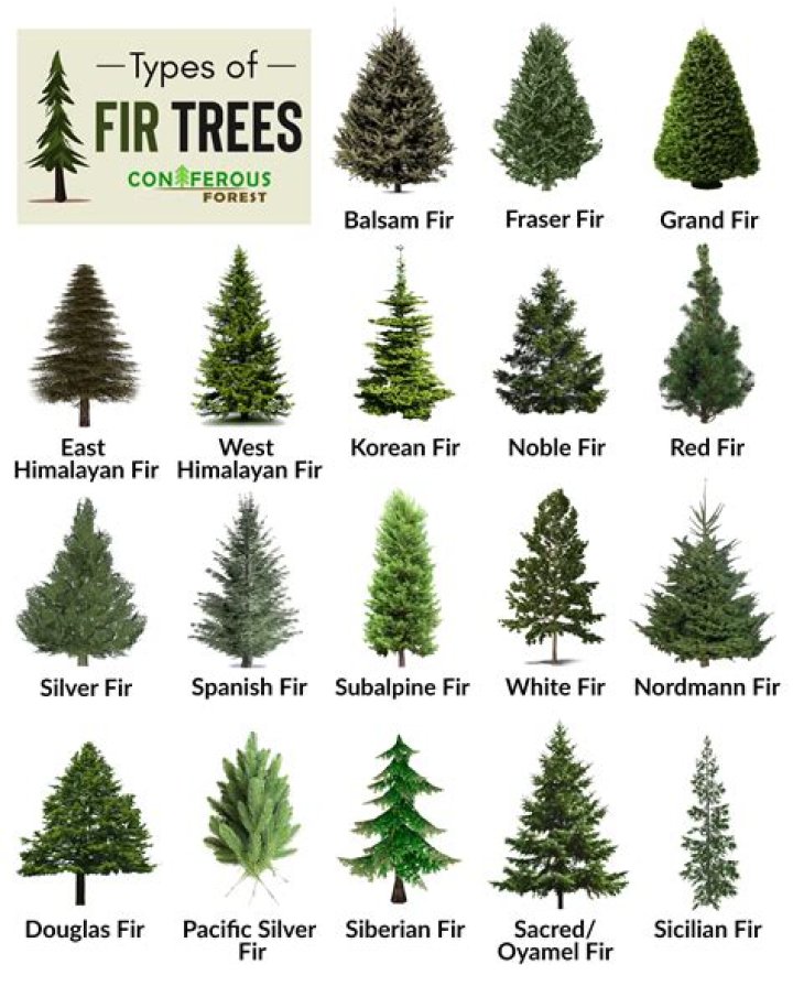 Fir. Bark on young trees is usually smooth and gray, becoming furrowed with age. Often develop into a tall and upright “classic” shape. Shape is similar to a spruce, but with a little more room between the branches.