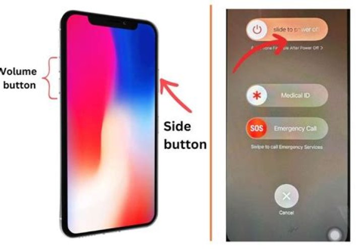 - Press and hold the side button and the volume down button until the power-off slider appears on screen.
