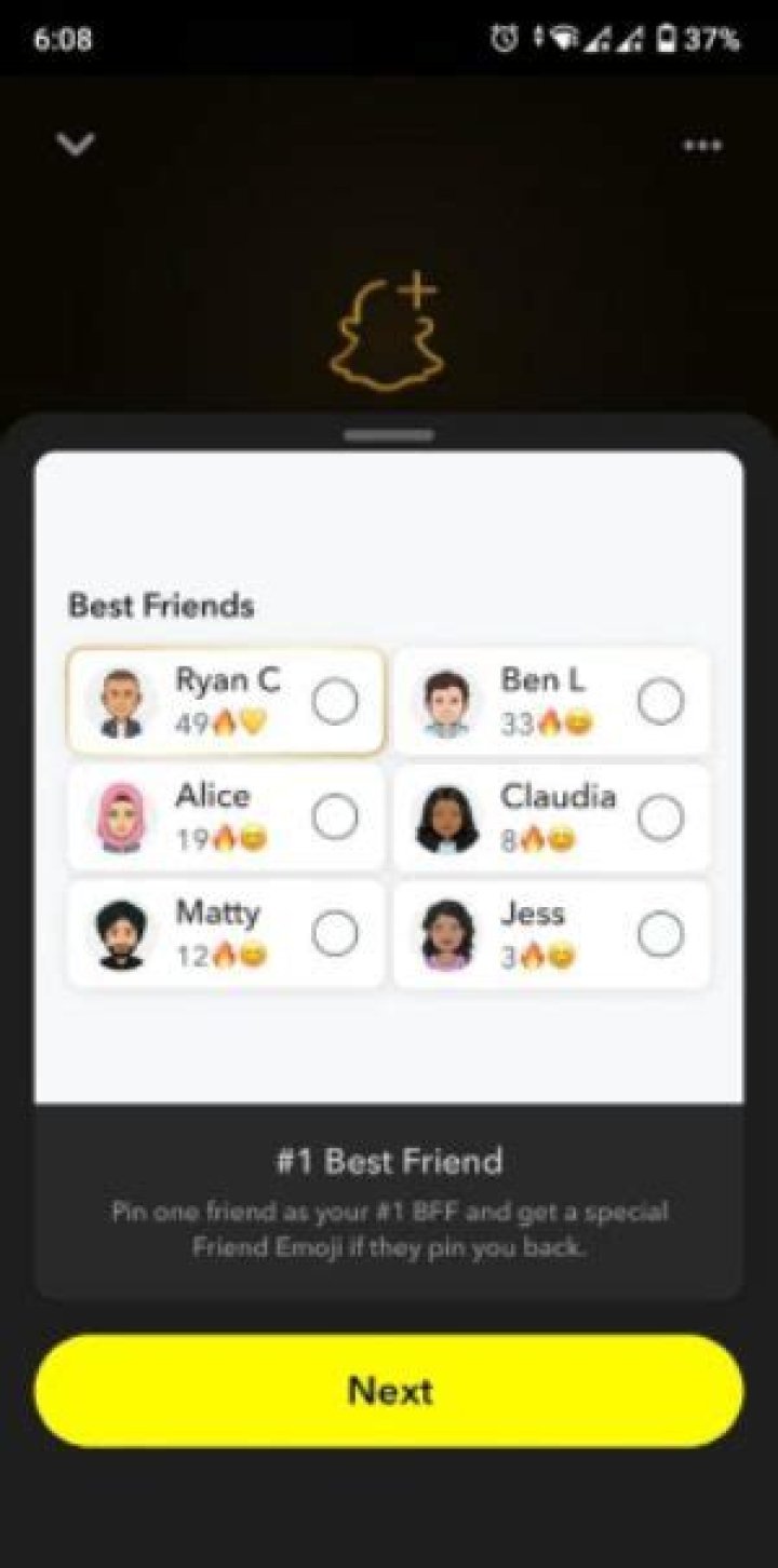 On Snapchat, this emoji next to a contact denotes a person that you snap the most, and who also snaps you the most (#1 best friend). The yellow #1 BF heart turns into a red heart after two weeks.What comes after Super BFF on Snapchat?