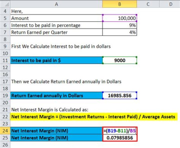 Net Interest Margin Using Formula is calculated as: Net Interest Margin = (Net return on investment – Interest paid) / Average Assets. Net Interest Margin = (25,000 – 9,000) /100,000. Net Interest Margin = 0.16 or 16 %