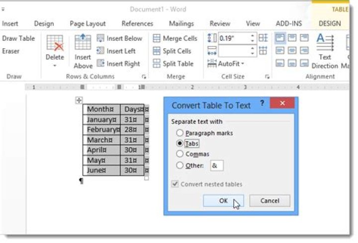 - From the Table Tools Layout tab in the Data group, select Convert to Text .