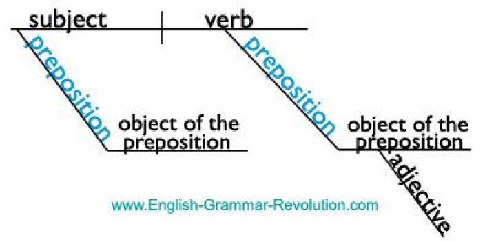 Directions: Put the preposition on a slanted line under the noun that it modifies (in this case, the subject). Put the object of the preposition on a horizontal line after it. All of these prepositional phrases modify the subject of the sentence.What does a diagram look like?
