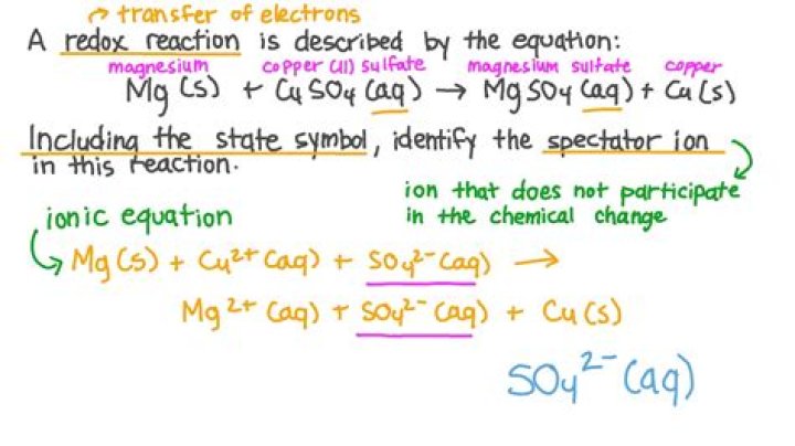 In a redox reaction, a spectator ion is anion whose oxidation number does not change in the course ofthe reaction. For example, consider the redoxreaction: 2Al + 3CuCl2 → 2AlCl3 + 3Cu. In thisreaction, the chloride ion is a spectator ionsince its oxidation number doesn't change.What is an ionic equation?