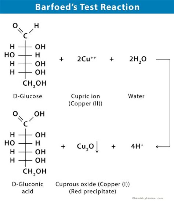 Barfoed's test is used to detect the presence ofmonosaccharide (reducing) sugars in solution. Barfoed'sreagent, a mixture of ethanoic (acetic) acid and copper(II)acetate, is combined with the test solution and boiled. A redcopper(II) oxide precipitate is formed will indicates the presenceof reducing sugar.