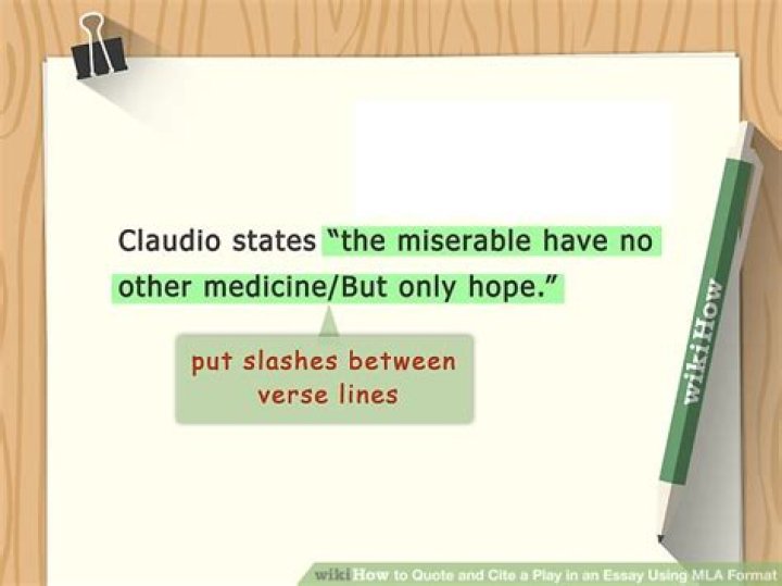 To cite a specific quotation from a playin MLA style, place the quotation in quotation marks(using slashes to indicate line breaks) and end with aparenthetical citation of author, name of play, andthen page/act (for prose plays) or act/scene/line(s) (forverse).