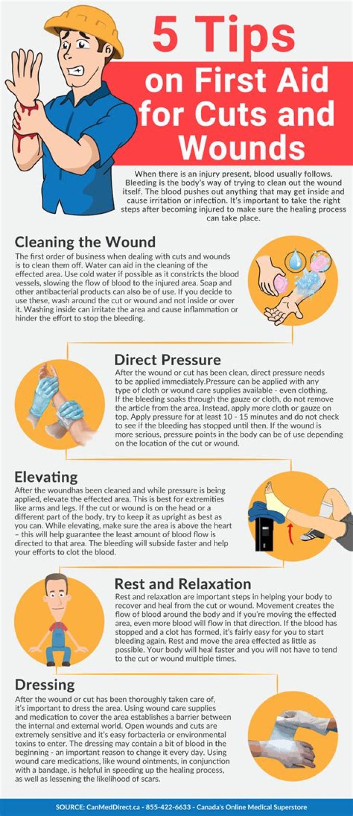 First, wash and disinfect the wound to remove all dirt and debris. Use direct pressure and elevation to control bleeding and swelling. When wrapping the wound, always use a sterile dressing or bandage. Very minor wounds may heal without a bandage.