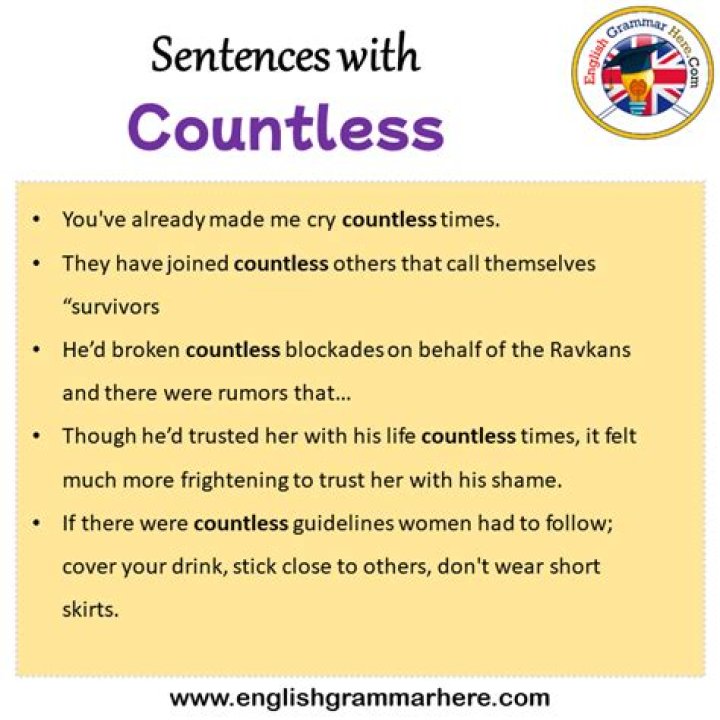 countless Sentence Examples. He had twenty assassins to rescue and countless souls waiting to be claimed. I ruled Death's domain for countless millennia. The country is covered with countless mounds (tells), each of which marks the site of a town.