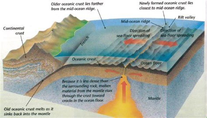 Abundant evidence supports the major contentions of the seafloor-spreading theory. First, samples of the deep ocean floor show that basaltic oceanic crust and overlying sediment become progressively younger as the mid-ocean ridge is approached, and the sediment cover is thinner near the ridge.What happens as a result of seafloor spreading?