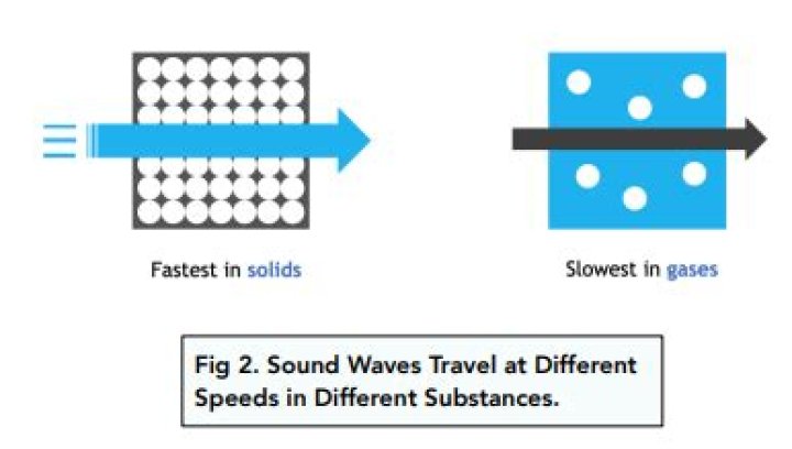 Sounds can travel at approximately 6000 metresper second in some solids and at a quarter of this speed inwater. This is because the molecules of solids are moretightly packed together than in liquids and those in liquids aremore tightly packed than in gases..