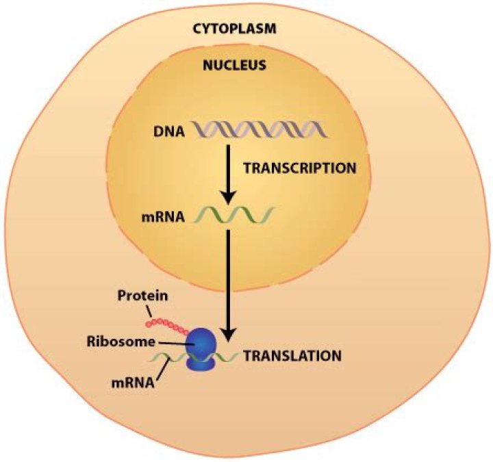 After mRNA is synthesized by DNA during transcription, the new molecule moves from the nucleus to the cytoplasm, passing through the nuclear membrane through a nuclear pore. Ribosomes are the sites of translation, or the use of the information in mRNA to manufacture the corresponding protein..