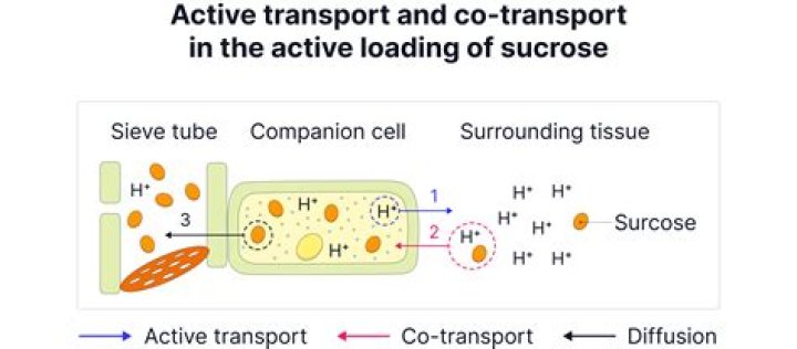 The cotransport of a proton with sucrose allows movement of sucrose against its concentration gradient into the companion cells. occurs. From the companion cells, the sugar diffuses into the phloem sieve-tube elements through the plasmodesmata that link the companion cell to the sieve tube elements.