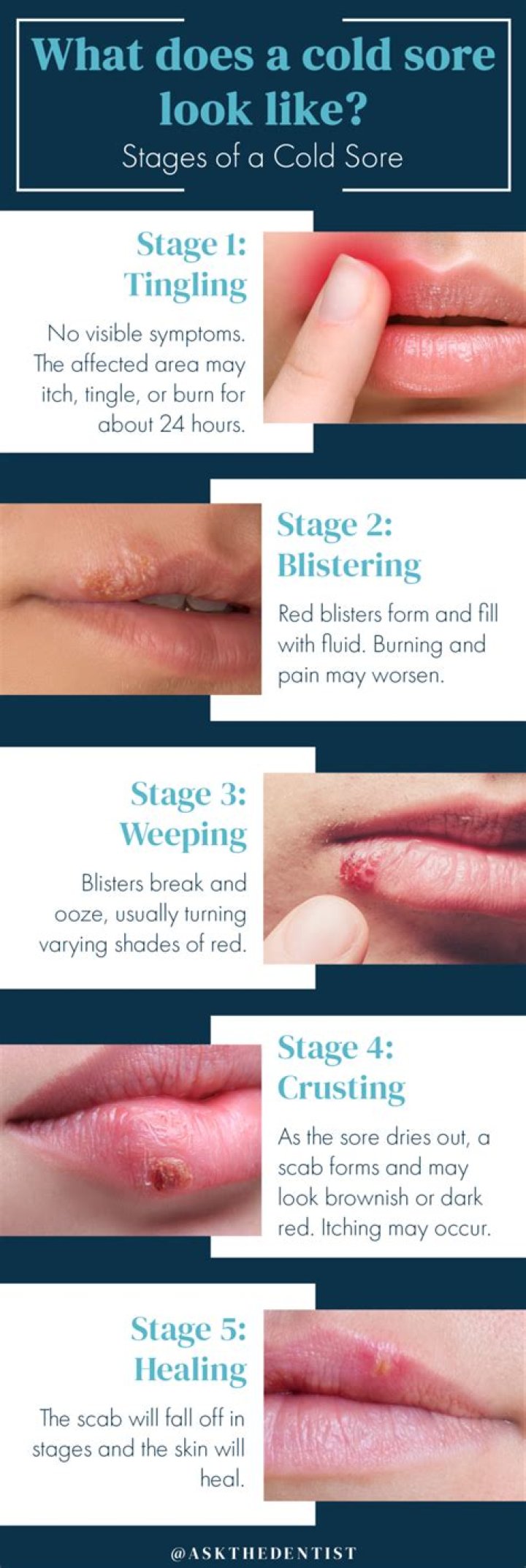 - Stage 5: The scab falls off and the cold sore heals.