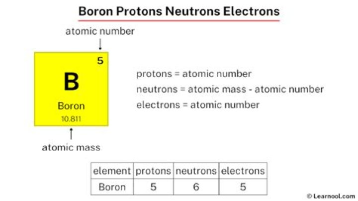 Explanation: Boron has 5 protons, 5 neutrons and 5 electrons. The atomic number (also known as the proton number) of Boron is 5 as it has 5 protons. It has a mass number of 10, as protons and neutron have a relative atomic mass of 1 each, and a neutral charge, as there are equal numbers of +1 protons and −1 electrons.