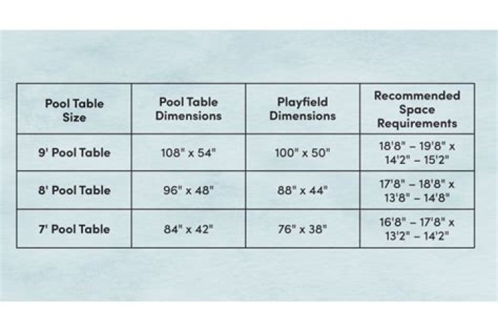 For tables measuring 4½ feet by 9 feet, the ideal space would be 14½ feet by 19 feet for their respective sides. Bar tables measuring 4 feet by 8 feet, need at least 14 feet by 18 feet of floor space.How much does it cost to Refelt a pool table?