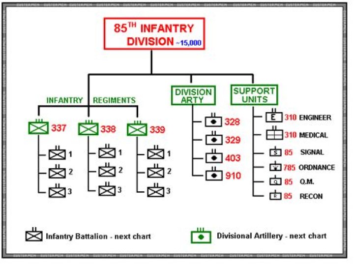 There were 5 types of divisions: infantry, mountain, armored, airborne, and cavalry. 91 divisions were mobilized during the war: 68 infantry divisions, 1 mountain division, 16 armored divisions, 5 airborne divisions, and 2 cavalry divisions.