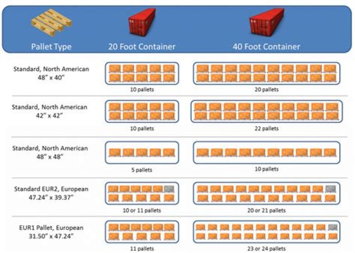 Approximately 1200-1400 handable cartons (boxes). How many pallets fit into a 20' or 40' container? A 20'ft container can hold eleven "Europallets" in one tier or nine to ten standard pallets in one tier while a 40' container can hold 23-24 "Europallets" in one tier or 20-21 standard pallets in one tier.
