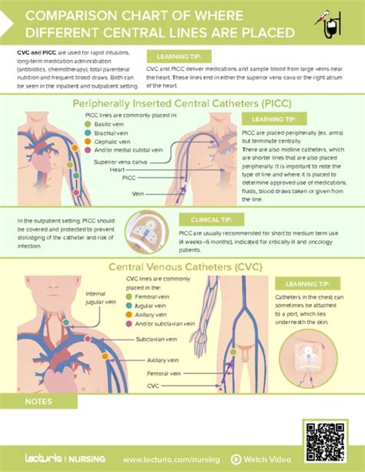 A PICC line is a longer catheter that's also placed in the upper arm. Its tip ends in the largest vein of the body, which is why it's considered a central line. PICC stands for "peripherally inserted central-line catheter.” A CVC is identical to a PICC line, except it's placed in the chest or neck.Are you sedated for PICC line insertion?