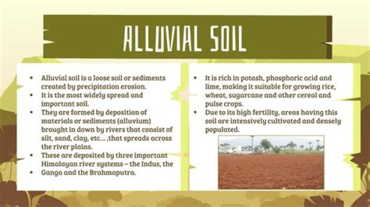 Alluvium. Alluvium, material deposited by rivers. It is usually most extensively developed in the lower part of the course of a river, forming floodplains and deltas, but may be deposited at any point where the river overflows its banks or where the velocity of a river is checked—for example, where it runs into a lake.Which crops grown in alluvial soil?