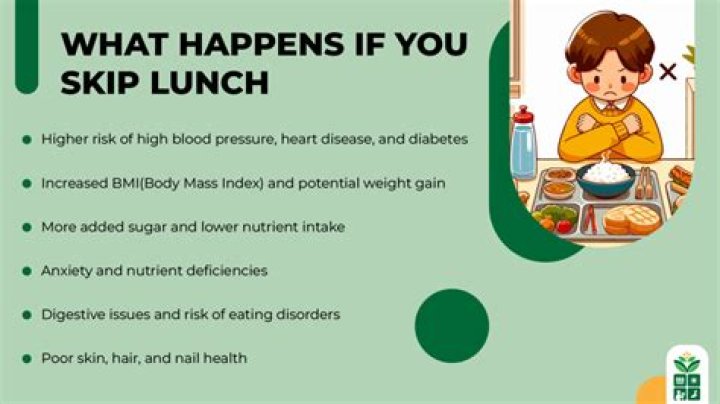 Also, should you skip lunch dinner? Snacking often doesn't satisfy your hunger to the same extent as eating a proper lunch. A normal-sized lunch and dinner is a healthier option — and a better way to cut calories — than skipping lunch altogether and eating a huge dinner. Additionally, when you don't eat enough food, your body can go into starvation mode.