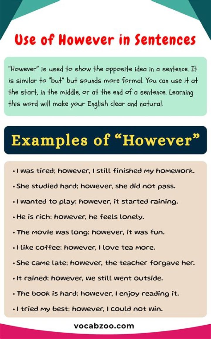 However means "even so" or, "on the other hand," and you use it to introduce a complication or contradiction. You might tell your friend, "I love your cooking. However, I already have plans for dinner tonight." The adverb however has a few different meanings. It often shows contrast.What is the difference between but and however?