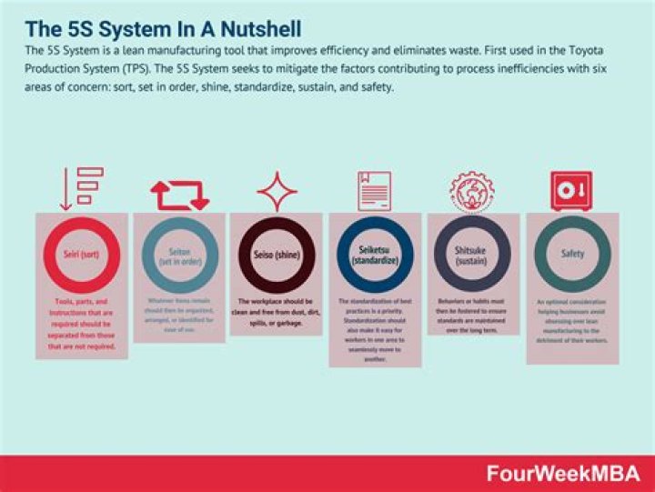 5S System. The 5S system of visual management has improved organization and efficiency in many workplaces including manufacturing environments and offices. This system consists of five pillars—Sort, Set in Order, Shine, Standardize, Sustain—that make maintaining the workplace in good condition a visual process.Where did Kanban come from?