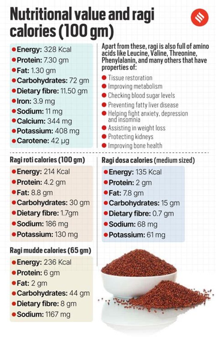 One Ragi Roti (without oil) gives 64 calories. Out of which carbohydrates comprise 56 calories, proteins account for 6 calories and remaining calories come from fat which is 31 calories. One Ragi Roti provides about 5 percent of the total daily calorie requirement of a standard adult diet of 2,000 calories.Does Ragi cause acidity?