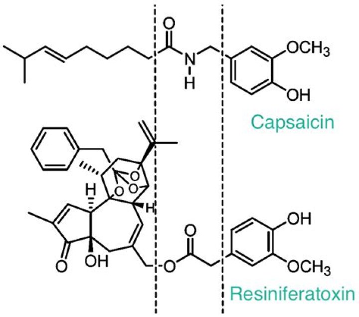 Likewise, what is Resiniferatoxin used for? The primary action of resiniferatoxin is to activate sensory neurons responsible for the perception of pain. It is currently the most potent TRPV1 agonist known, with ~500x higher binding affinity for TRPV1 than capsaicin, the active ingredient in hot chili peppers such as those produced by Capsicum annuum.
