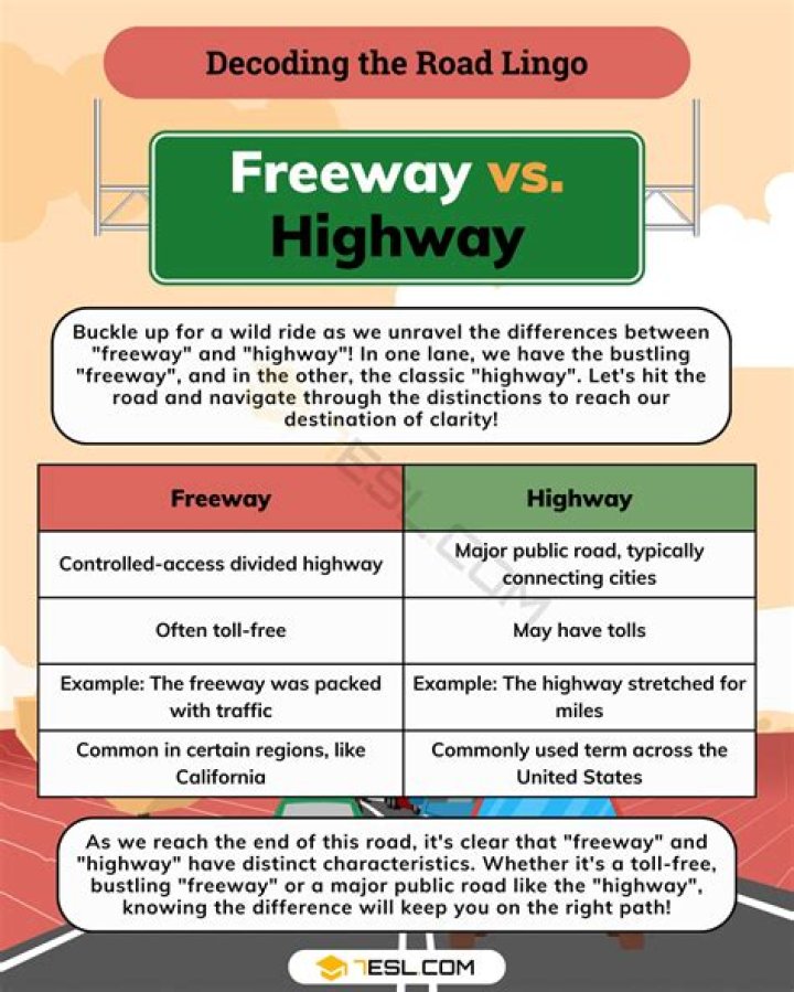 To be serious - a motorway is an older term in not muchuse in the US. A highway is a (usually) a primaryroad. A byway is a secondary road. A freeway is ahighway with controlled access (such as aninterstate)..