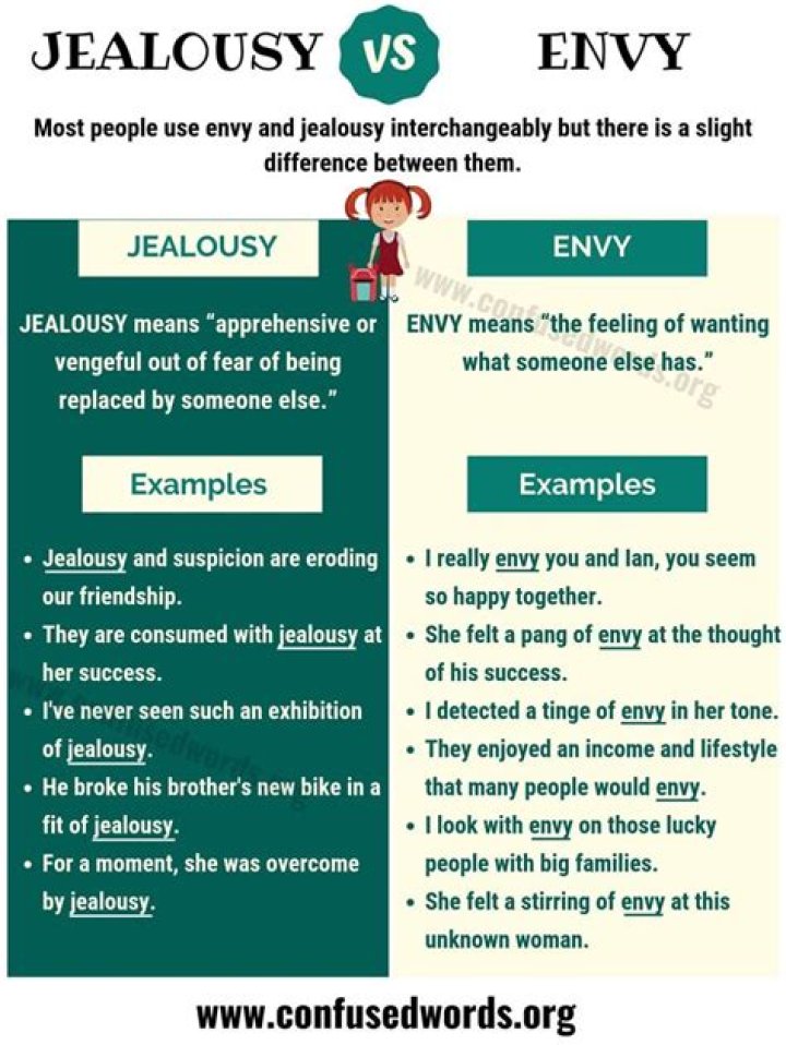 It's no fun to feel envy or jealousy because bothmake you feel inadequate. Envy is when you want what someoneelse has, but jealousy is when you're worried someone'strying to take what you have. If you want your neighbor's newconvertible, you feel envy.