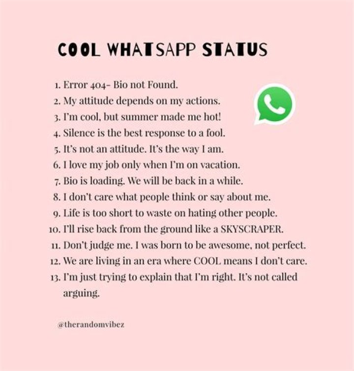 Cool Whatsapp Status “Brains are awesome, I wish everyone had one.” “Everybody has a section they don't peruse so anyone can hear.” “I don't care what people think or say about me.” “Well, I am a man of my words.”How can I use WhatsApp status?