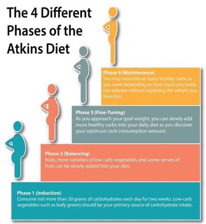 The Atkins Diet Is a 4-Phase Plan The Atkins diet is split into 4 different phases: Phase 1 (induction): Under 20 grams of carbs per day for 2 weeks. Eat high-fat, high-protein, with low-carb vegetables like leafy greens.
