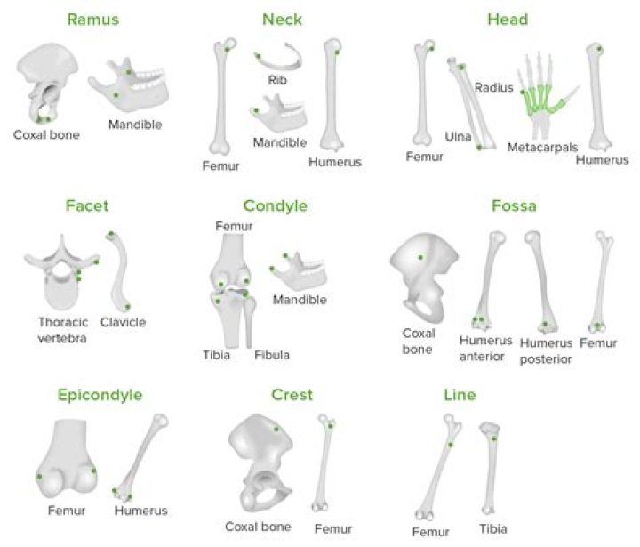 - Arms – shoulder blade (scapula), collar bone (clavicle), humerus, radius and ulna.