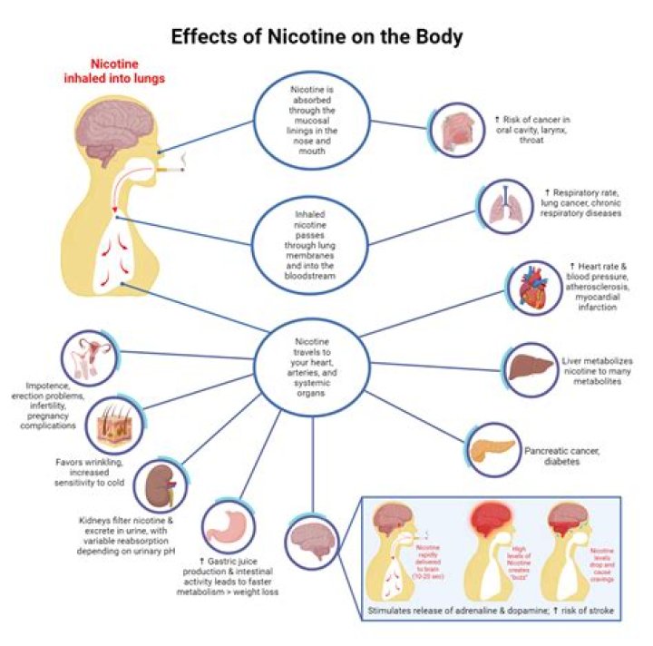 Nicotine reaches the brain within 8 seconds of inhalation. Its effects on the body include increased heart rate and blood pressure, increased alertness, and reduced appetite. Although nicotine is an addictive substance, it is actually the tobacco in nicotine products that can cause deadly cancers.How harmful is nicotine alone?