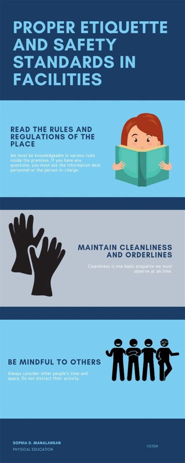 Subsequently, question is, why there is a need for us to have a proper etiquette and safety in the use of facilities and equipment? If facilities are cared for and used well, they will have a longer shelf life. Others will be able to benefit from their use. Conducting proper etiquette in the use of facilities also ensures the safety of those who use them. The risks in using them are minimized.
