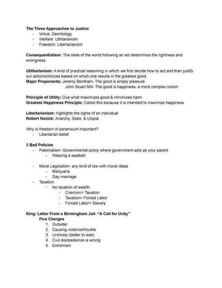 We then examine three overarching theories that might serve to unify the different forms of justice: utilitarianism, contractarianism, and egalitarianism.
