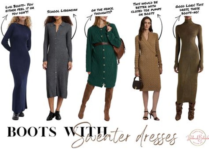 Pair a Sweater Dress With Boots Boots and sweater dresses go hand in hand to give you that relaxed, classy look. Tall boots are classic and elegant. Ankle booties are a little edgier and modern. Boots with a stacked heel complement earthy knits by adding balance.