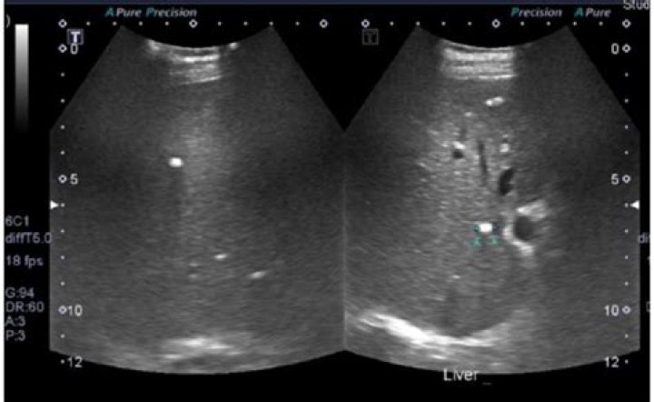 Although relatively uncommon in daily clinical practice, calcification may be found in inflammatory hepatic lesions and in benign and malignant liver neoplasms. In hepatocellular adenoma, calcifications may be solitary or multiple and are usually located eccentrically within a complex heterogeneous mass.