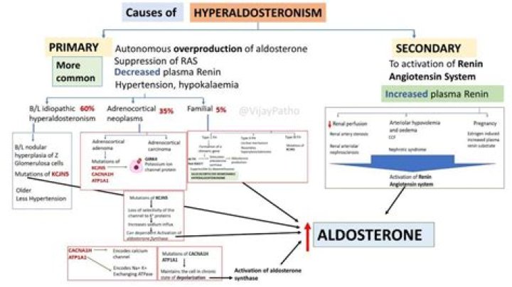 If your doctor suspects primary aldosteronism, you'll likely have a test to measure levels of aldosterone and renin in your blood. Renin is an enzyme released by your kidneys that helps control blood pressure. If your renin level is very low and your aldosterone level is high, you may have primary aldosteronism.What are the signs and symptoms of Conn's syndrome?