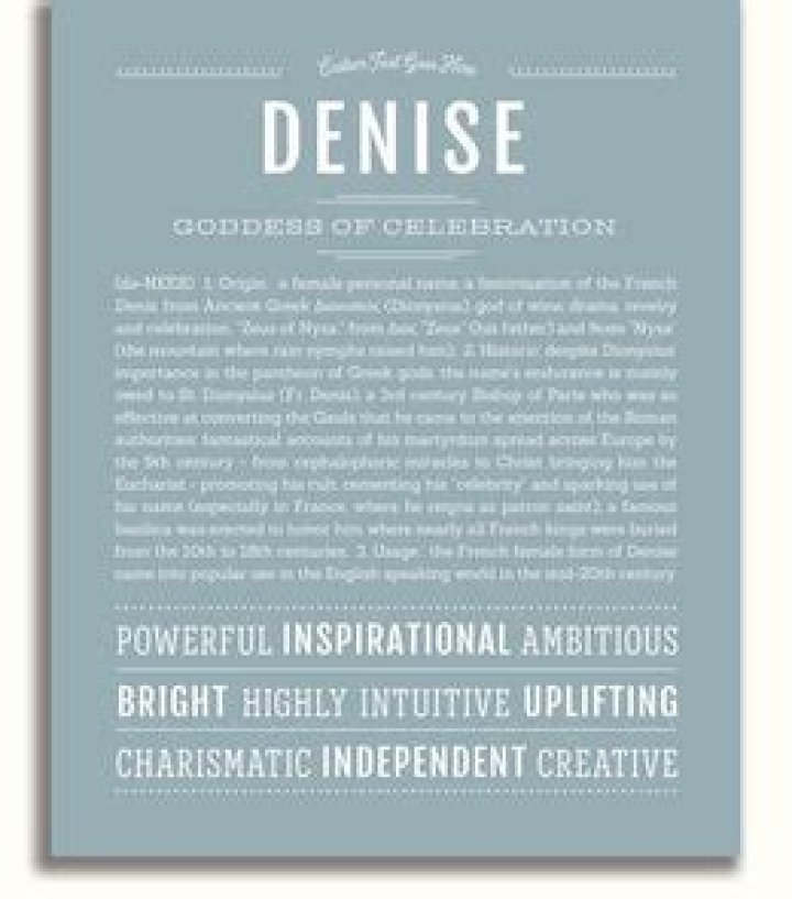 Contribute your knowledge to the name Denise The popular song of 1963 by Randy and the Rainbows - Oh Denise, made a rare name have a short run of popularity. It is more common today for Denise to be a middle name. It's a nice name.What does Bacchus mean?