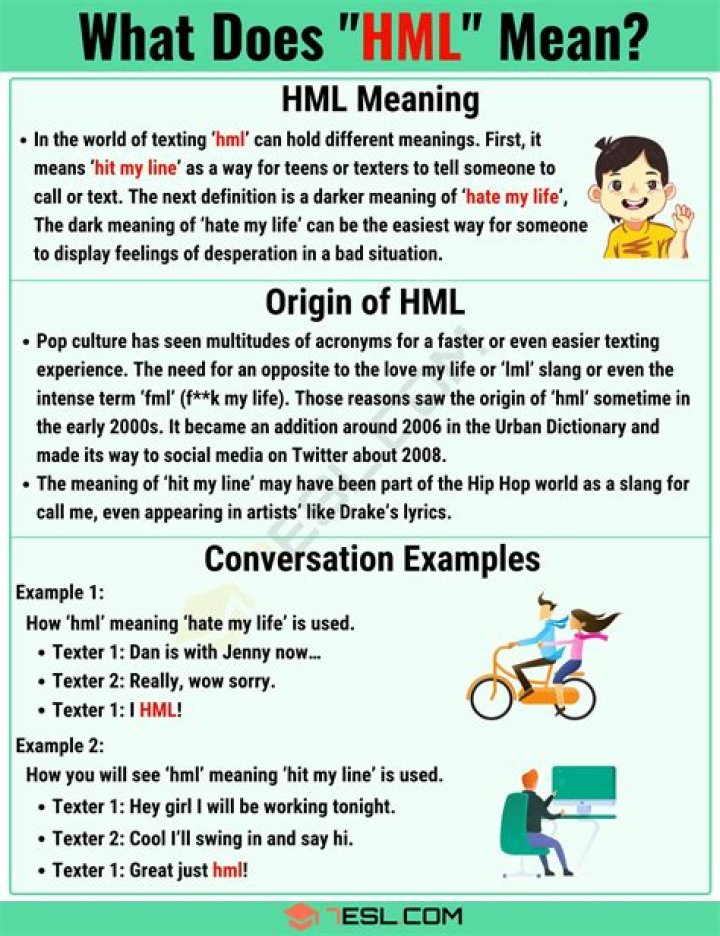 HML is an internet acronym short for hate my life or hit my line..