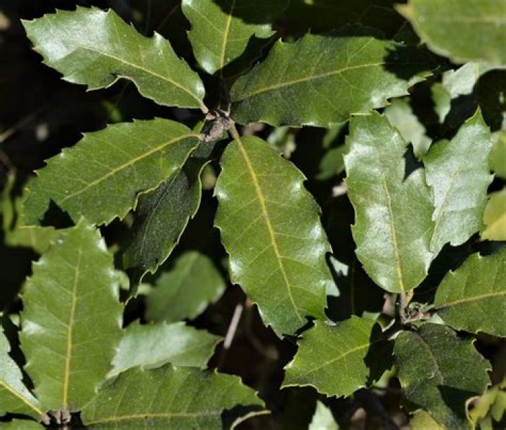 The holly oak is a tough evergreen tree as wide as it is tall with a dense rounded crown. It has smooth gray bark. The leaves are a leathery, glossy, dark green and vary in size and shape. Holly oak tolerates a wide variety of soil textures, salt, and drought, but is sensitive to cold..